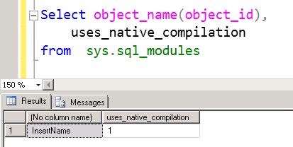 A new column uses_native_compilation has been added to identify if it’s a natively compiled procedure. Same is true for sys.all_sql_modules as well. We already have a proc in the database.