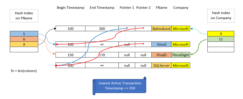 In above we have end timestamp available for row 1 (Balmukund, Microsoft) and row 3 (PinalD, PluralSight). Notice First and forth row – End Timestamp for Row 1 is Begin Timestamp for Row 4. This would mean that we have fired “Update” and Modified Balmukund to SQLServer at timestamp 300. On the other hand, row 3 was deleted from the system via “Delete” statement at timestamp 170. As indicated in picture, the lowest active transaction time stamp is 350, which means that there is no “active” transaction in the SQL Server whose timestamp is less than 350. Recall that the life of a row is determined by begin and end timestamp. Since all the transactions are above timestamp 350, there is no transaction which would “need” those rows. This would mean that rows 1 and 3 are eligible for the garbage collection. These rows can be removed and their memory can be released back to the system.