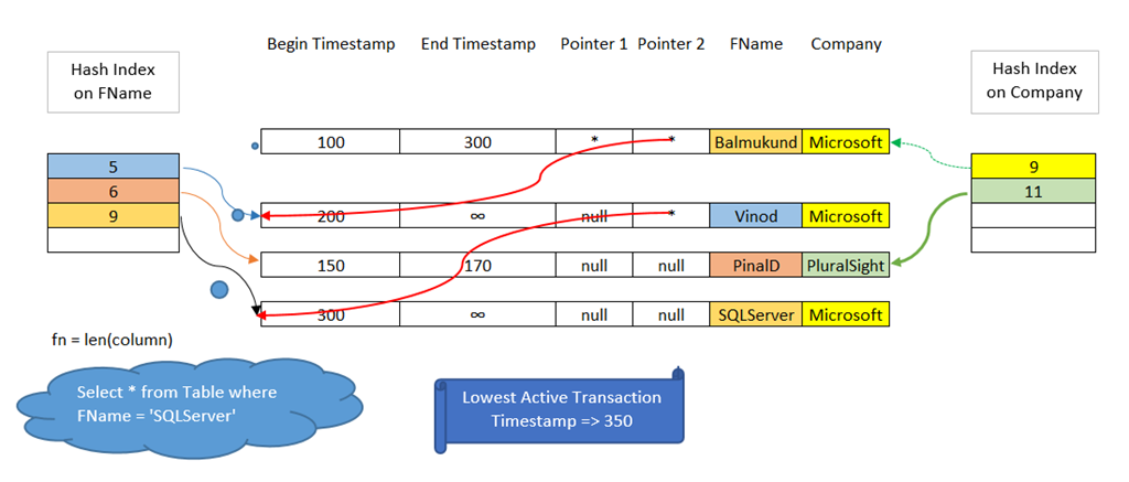 Let’s assume that there is a select statement fired which is using hash Index created on FName column (for example select * from table where FName = ‘SQLServer’). Since hash value of column is 9, it would scan all rows of the bucket. While doing that it would find a row (Balmukund, Microsoft) which is stale (Refer Image#1). The reader thread would delink that row from the chain and move forward. Note that the row is still NOT deleted from memory but a little work of garbage collection has been done. Here is the after image after select query.