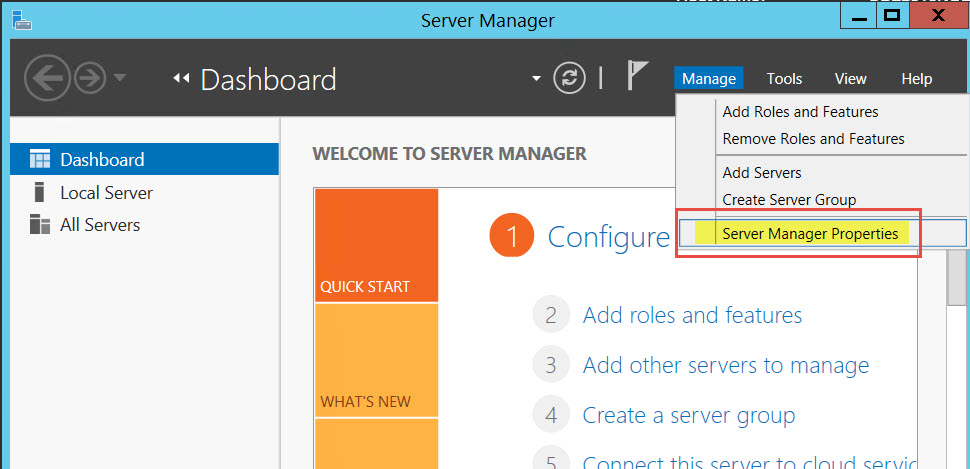 • Disable it via server manager:  If it’s not needed for many server then we can do it directly via Server Manager itself. On Server Manager console, choose Manage and then click “Server Manager Properties”.