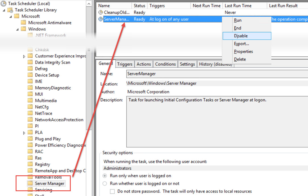 • Disable it via Task Scheduler:  Another method to not to launch Server Manager dashboard is using task scheduler. We can do this by launching the “Task Scheduler” on the local machine. In the Task Scheduler console (On the right hand side) navigate to Task Scheduler library > Microsoft > Windows > Server Manager. Now choose “ServerManager” task, right click and click on Disable.