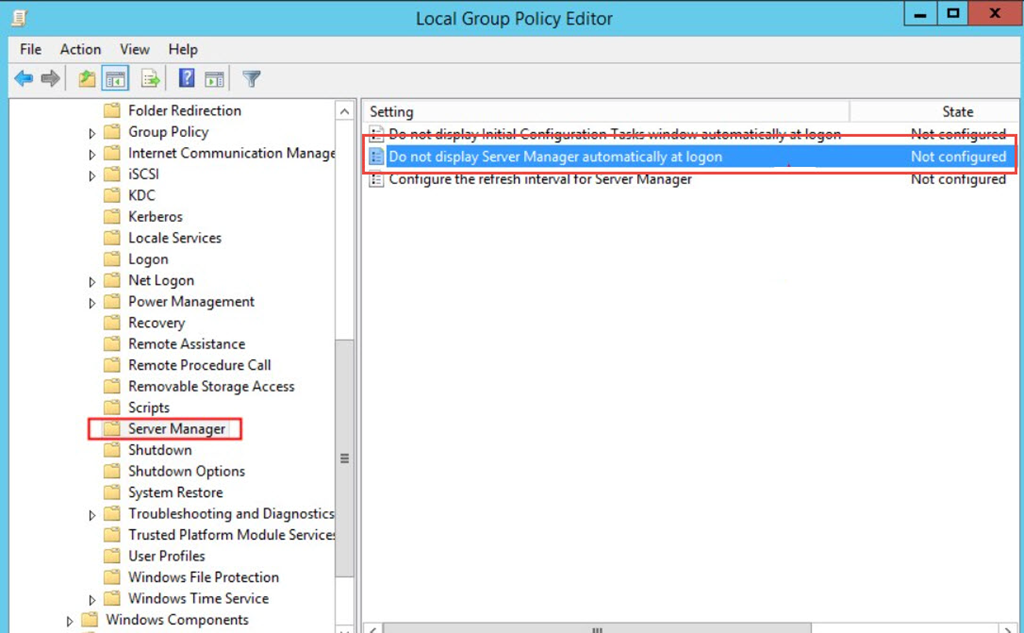 • Disable it via Global Policy (GPEDIT):  If you are a domain admin and want to apply policy then you can use gpedit.msc. Once opened, navigate to “Computer Configuration”, > Administrative Templates > System > Server Manager. Under setting look for “Do not display Server Manager automatically at logon”, right click and choose Enabled.