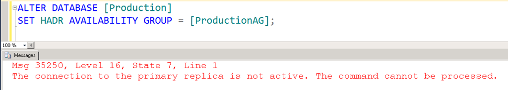 Solution : The connection to the primary replica is not active. The command cannot be processed.