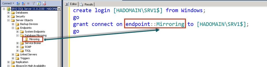 grant connect on endpoint::Mirroring to [HADOMAIN\SRV1$];