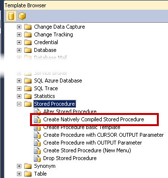 Same as CREATE TABLE, there is no special interface available for natively compiled procedure. We can use either Right Click technique (#1) or template browser (#2) to reach to template.