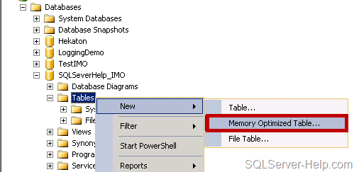 If we go with conventional way of creating table using SSMS then we can Right Click on “Tables” folder under the database SQLSeverHelp_IMO and choose New > Memory Optimized Table