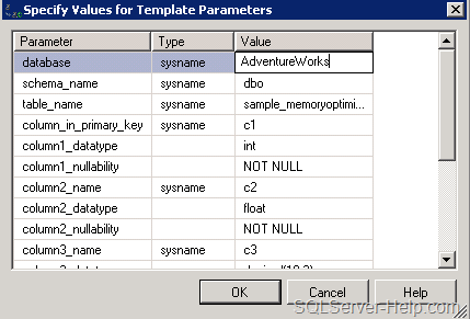 In this query windows, we need to use Ctrl+Shift+M and replace the parameter as needed. We can add more columns, indexes and make modifications. As the commented section in above template says, we need to have filegroup defined for memory_optimized_data
