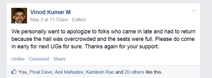 It was full day event with session lined up on SQL Server 2014 new features. We have booked a room with 150 capacity and had a clue that we are overbooked so food was ordered for higher quantity