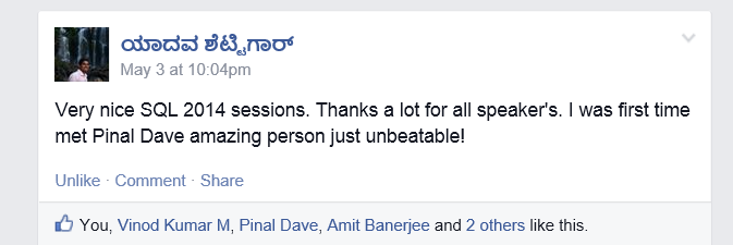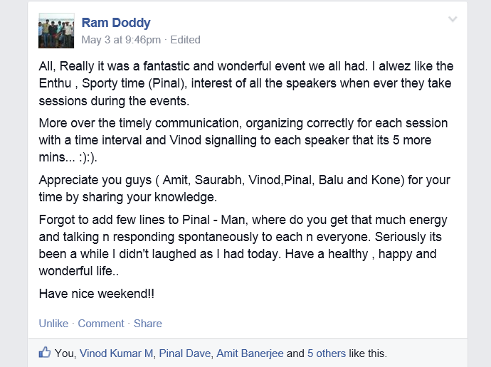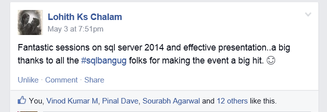 Last weekend, 3rd May 2014, was another remarkable day in history of SQL Bangalore User Group Meetings chapter. For those who are in Bangalore and have not attended the user group meeting has missed something. The meeting announcement was made on 18th April and I was one of the speaker along Sourabh, Amit, Pinal, Vinod and Kane (In order of the sessions). Amit has already given a summary and information about the sessions here (A full house–We could not have asked for more)